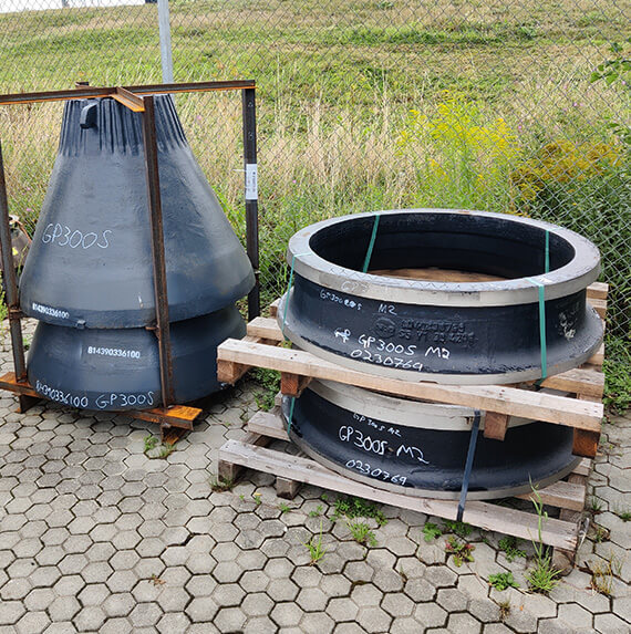 SCP prodaje potrošne i zamjenske dijelove za konusne drobilice Metso* GP300S. Dijelovi bi također trebali odgovarati modelima G12, G2812 i G3812. Naši potrošni dijelovi drobilice proizvode se s različitim udjelima mangana kako bi se maksimizirale performanse i vijek trajanja za vašu specifičnu primjenu konusne drobilice.